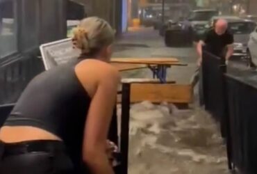 Moment bar is battered by torrential flash flooding with drenched staff fighting against tide of rainwater as thunderstorms lash Britain The King Cons Bar in…