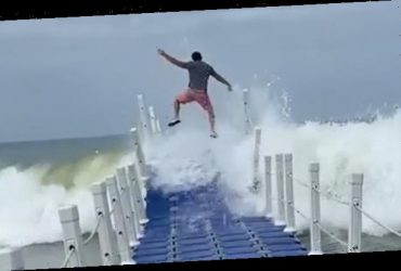 Riding the waves: Daredevils leap over breakers as they send huge ripples along floating bridge at beach resort Footage was captured at the Maliah Beach…