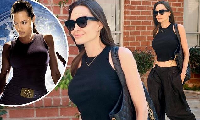 The Hollywood superstar, 47, flashed her taut tummy while sporting a cropped black tank top, reminiscent of the one her character wore in the popular action-adventure Tomb Raider films.