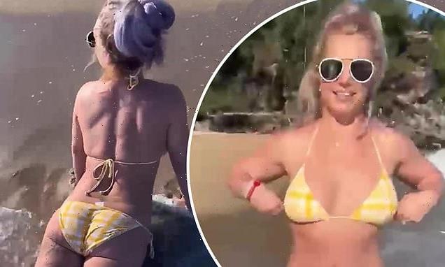 Britney Spears shows off sensational bikini body as she flounces around the beach in video set to Cardi B… in wake of feud with sister Jamie Lynn