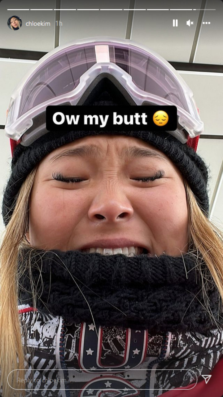 Between her second and third runs, Chloe took to her Instagram Story to let her followers know how it felt to fall from such heights. Over a photo of her closing her eyes and grinding her teeth, she wrote, “Ow my butt,” adding a pensive face emoji.