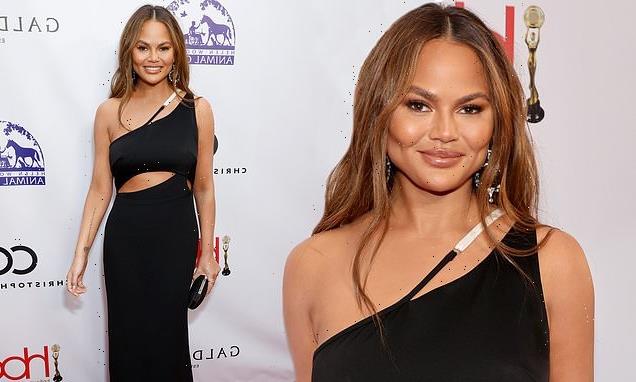 Chrissy Teigen exhibits her toned midriff in a black cutout maxi dress as she leads the stars at the Hollywood Beauty Awards