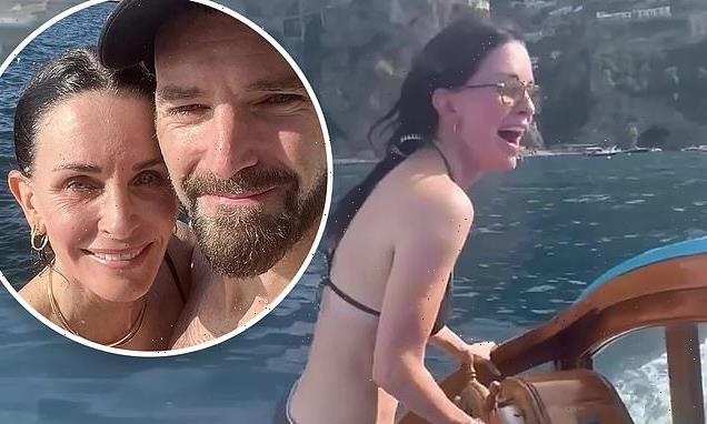 Zoom: Courteney Cox, 58, rocked a bikini as she zoomed in a boat through the waters off the Amalfi coast