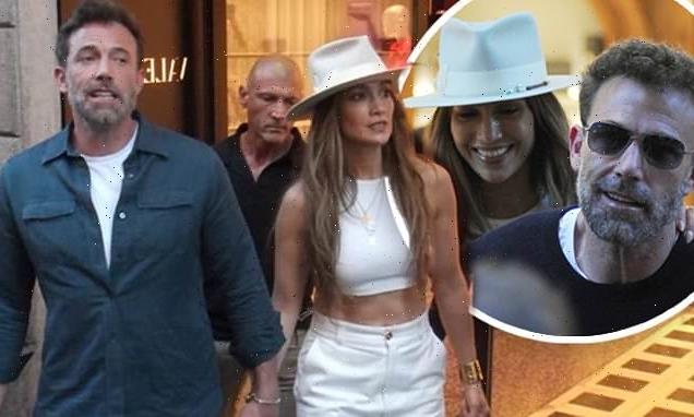Jennifer Lopez and new husband Ben Affleck delight fans with a romantic sidewalk KISS as they lovingly hold hands while shopping in Milan during romantic honeymoon tour