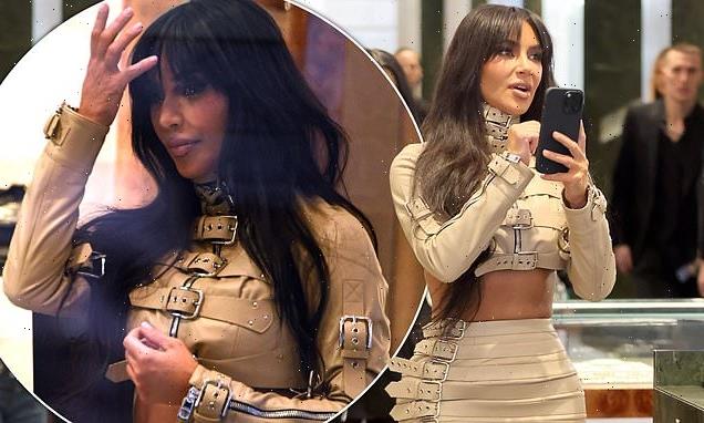 Kim Kardashian flashes her midriff in a racy cream co-ord made of BELTS as she peruses the Dolce & Gabbana store in Milan