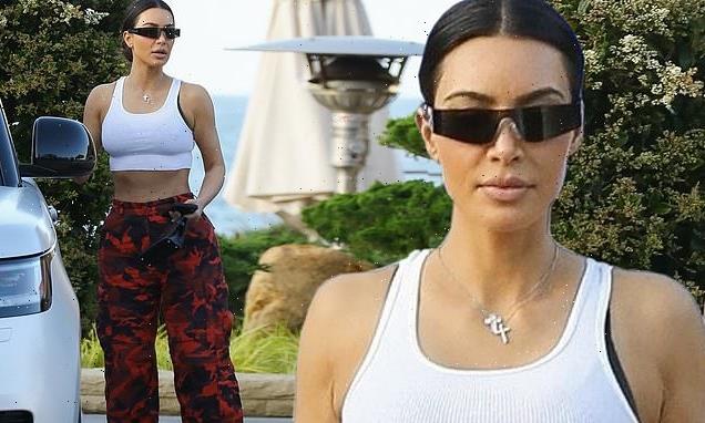 Kim Kardashian flaunts VERY tiny waist in a sports bra and red camo pants as she treats daughter North West, nine, and pals to dinner at Nobu Malibu