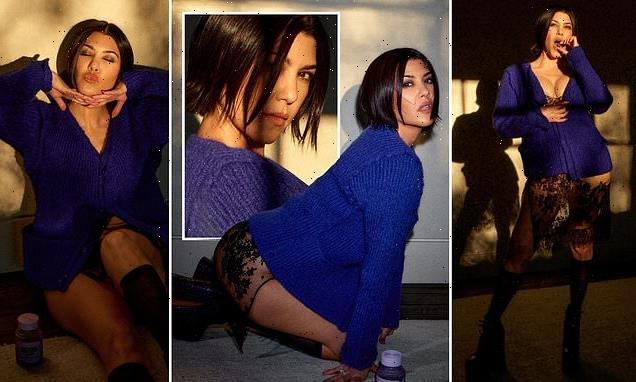 Kourtney Kardashian teases her pert derriere in a sheer lace skirt in sultry photo shoot for Lemme gummies