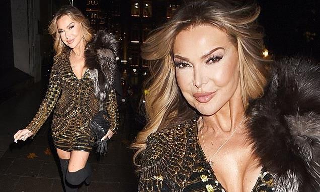 Lizzie Cundy sends temperatures soaring in a gold metal embellished mini dress and thigh-high boots while attending a Balmain fashion show