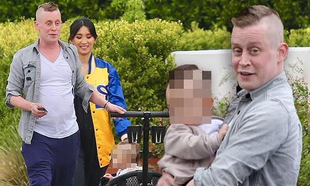 Family: Macaulay Culkin, 41, and his fiancée Brenda Song, 34, enjoyed a soothing stroll through a Los Angeles neighborhood with their 11-month-old son Dakota joining in a wagon