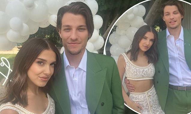 Millie Bobby Brown stuns in a bridal white lace co-ord as she celebrates her engagement to beau Jake Bongiovi at a private family party