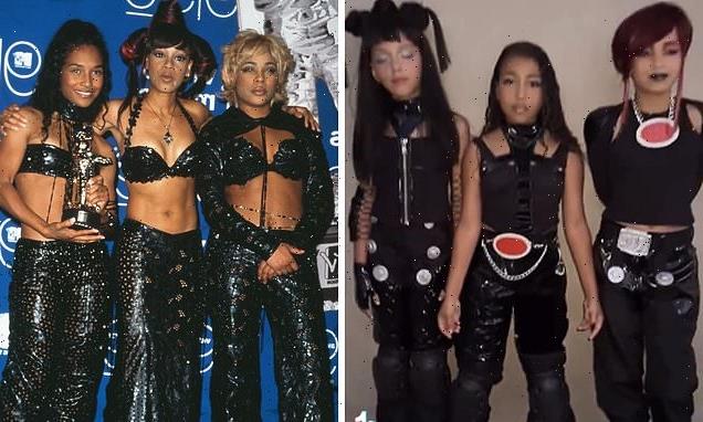 Kim Kardashian’s daughter North West recreates TLC’s No Scrubs music video while dressed as the ’90s girl group with two friends for Halloween
