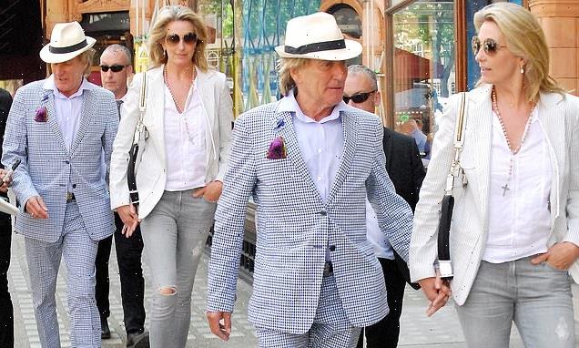 Rod Stewart, 77, looks dapper in a blue and white checked suit as he enjoys a romantic stroll with his chic wife Penny Lancaster, 51, in London