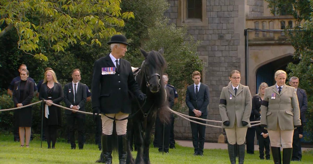 Queen Elizabeth II's favourite pony Emma stood alone on the side of the Long Walk as she bid her final farewell on Monday, 19 September.
