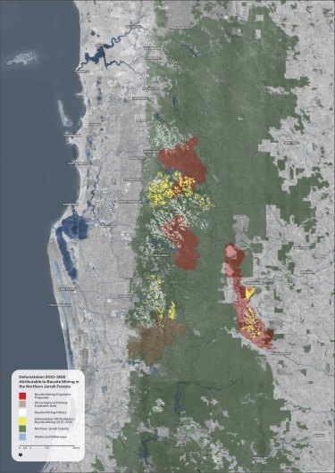 The WA government has committed to a ban of native forest logging from 2024 but this has not extended to existing mining operations which are anticipated to clear, mine and revegetate about 80,000 hectares of land by 2060.