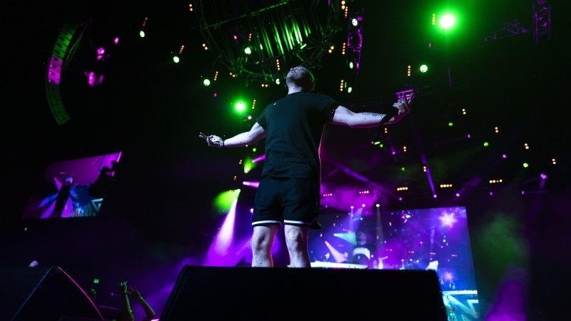 MC Pressure (Daniel Smith) performed as part of Hilltop Hoods at Qudos Bank Arena on Saturday.Credit:Rhett Wyman