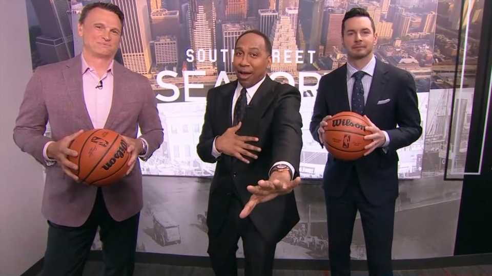 ESPN basketball analyst J.J Redick and Tim Legler surrounded Stephen A as he excitedly danced around.