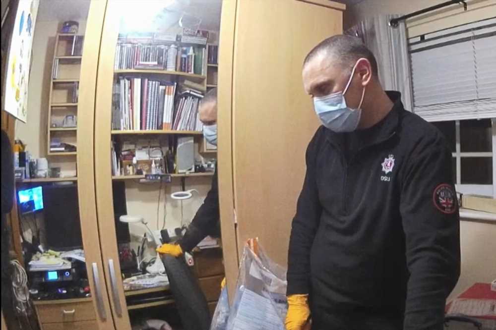 Police pull out a chest of drawers with USBs and floppy disks from a wardrobe – which were found to contain nearly 900,000 sick files of him sexually abusing dead bodies at Tunbridge Wells Hospital’s mortuary.