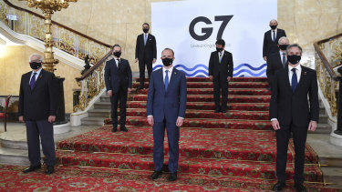 G7 foreign ministers meet, in socially distanced fashion, in London. This week they supported Taiwan’s inclusion in WHO meetings.Credit:AP