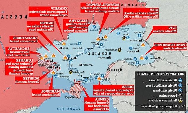 ‘Hundreds’ of Ukrainian troops have already been killed in early clashes, Kiev said, as the fight came to them on all fronts at a moment’s notice. Cruise missiles, guided bombs and GRAD rockets took out targets from east to west – aimed at airfields, military bases, ammo dumps, and command posts including in the capital.