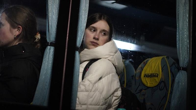 A young girl, who has fled Ukraine, looks out of the window of a bus as she prepares to travel to Przemysl after arriving at the border crossing in Medyka, Poland, on Sunday.Credit:AP