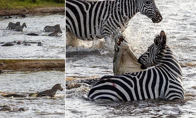 This is the incredible moment a zebra sunk its teeth into a crocodile’s throat, turning the tables on the predator after it lay in wait to attack a herd crossing a river in Kenya
