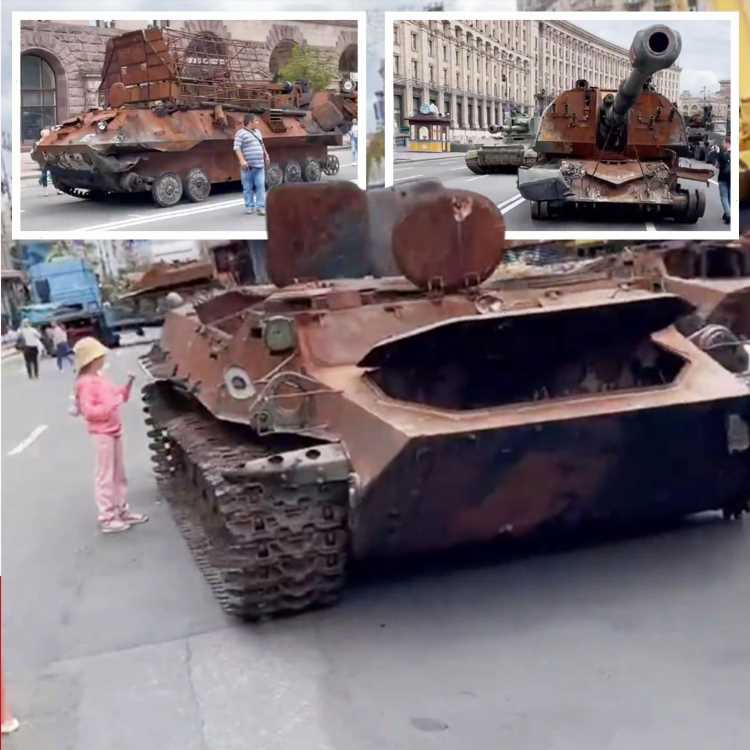 Powerful footage shows locals walking through a maze of destroyed and captured military vehicles that are being displayed in the streets of Kyiv as Putin's invasion continues to falter.