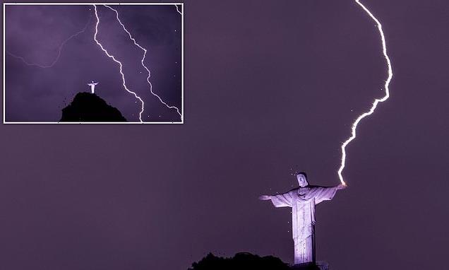 I am the light! Rio’s famous Christ the Redeemer statue appears to hold a lightning bolt in its hand