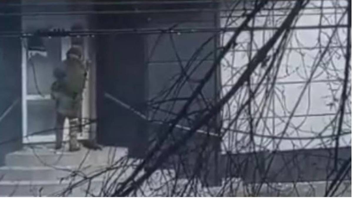The confrontation, dubbed the Battle of Techno House, shows a Russian soldier attempting to gain access into a store.